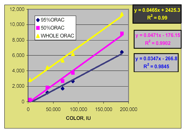 The antioxidant capacity of the five products correlates very well with their color (Figure 1) as the high antioxidant polyphenol components form a large part of the sugarcane color bodies. With some variations the "95%" and "50%" ORAC values are much lower than the "whole" ORAC, indicating that a substantial part of the antioxidant capacity is from components with
